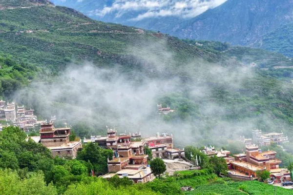 “甲居”,藏語是百戶人家之意。藏寨從大金河谷層層向上攀緣,一直伸延到卡帕瑪群峰腳下,整個山寨依著起伏的山勢迤邐連綿,在相對高差近千米的山坡上,一幢幢藏式樓房灑落在綠樹叢中?;蛐橇_棋布,或稠密集中,或在高山懸崖上,或在河壩綠茵間,不時炊煙裊裊、煙云繚繞,與充滿靈氣的山谷、清澈的溪流、皚皚的雪峰一起,將田園牧歌式的畫卷展示在人們眼前,以一種藝術品的形態存在。2005年由《中國國家地理》雜志組織的選美中國活動中,以甲居藏寨為代表的“丹巴藏寨”被評為“中國最美的六大鄉村古鎮”之首。