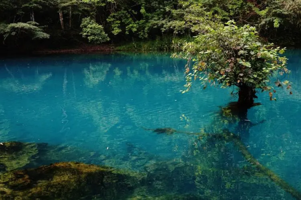 臥龍?zhí)段挥谂P龍河出水口,被稱為“小九寨”,水面平滑如鏡,水質(zhì)出奇的深邃。潭水由于深淺不同而呈現(xiàn)出不同的顏色,如深藍、湛藍、墨綠、碧綠等,變幻多端。潭邊怪石奇樹林立,古木森森,潭外水聲轟鳴,霧雨蒙蒙,四周高山緊鎖,水潭猶如地底深淵。