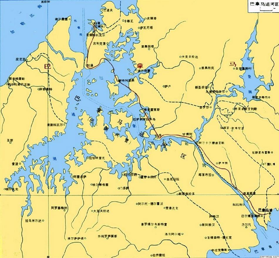 船只從大西洋通過運河到太平洋時,先經由利蒙灣(Limon Bay)內長約11公里的進口航道到達加通水閘。在加通有連續3座水閘將船只升高26公尺(85呎),進入加通湖。加通湖系由查格雷斯河(Chagres River)上的加通水壩攔蓄而成,湖巴拿馬運河地圖水源自阿拉胡埃拉湖(Alajuela Lake, 又名馬登湖〔Lake Madden〕;由馬登水壩攔蓄而成),面積425平方公里(164平方哩),版權所有山東聊城聊之旅國際旅行社有限公司,轉載必究!水深14~26公尺(46~85呎)不等,至甘博阿(Gamboa)長約37公里(23哩)。切穿大陸分水嶺的蓋拉德人工渠(Gaillard Cut, 又名庫萊布拉水道〔Culebra Cut〕)就是從甘博阿開始的。這條人工渠平均水深約13公尺(43呎),延伸約13公里(8哩)至佩德羅米格爾水閘(Pedro Miguel Locks)。佩德羅米格爾水閘將船只降低9公尺(30哩),進入高於海平面16公尺(52呎)的米拉弗洛雷斯湖(Miraflores Lake)。船只通過一條長約2公里(1哩)的水道,在米拉弗洛雷斯由兩級水閘降低至海平面。運河的最後一段是挖掘而成的進口航道,長約11公里(7哩),船只經此進入太平洋。運河全程的底寬至少150公尺(500呎);在加通湖,航道的寬度不等,介於150公尺(500呎)至300公尺(1,000呎)之間,而在米拉弗洛雷斯湖段航道寬度為225公尺(740呎)。