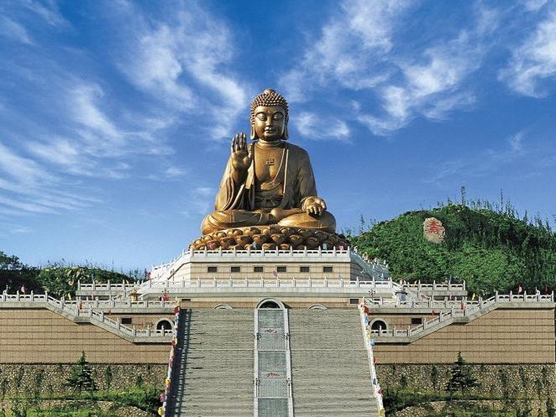 南山大佛為錫青銅鑄釋迦牟尼坐像,高38.66米,重380噸,由232塊銅板和108塊蓮花瓣,302個發髻焊接而成。大佛右手作“施無畏印”,左手作“施與原印”,表示佛為眾生拔除痛苦,給予幸福。