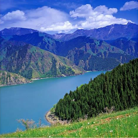 新疆天山天池風景名勝區以高山湖泊為中心,雪峰倒映,云杉環擁,碧水似鏡,風光如畫。