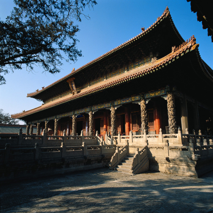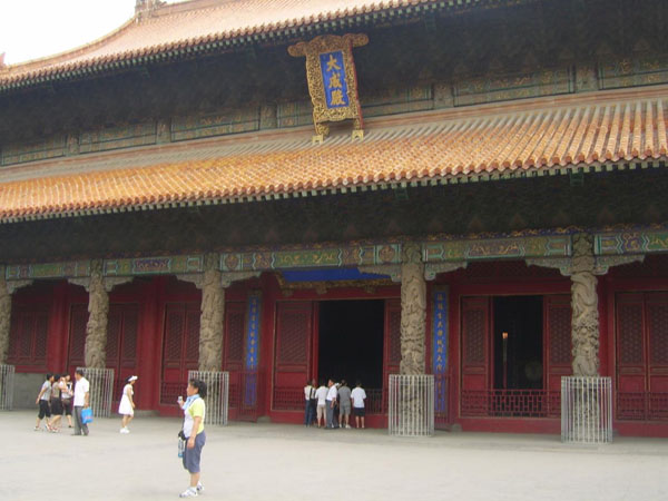 洙水橋北,先是一座綠瓦三楹的高臺(tái)大門——擋墓門,后面就到了供奉孔子木主的享殿。去享殿的甬道旁,有四對(duì)石雕,名曰華表、文豹、角端、翁仲。華表系墓前的石柱,又稱望柱;文豹,形象似豹,腋下噴火,溫順善良,用以守墓;角端,也是一種想象的怪獸,傳說(shuō)日行1萬(wàn)8千里,通四方語(yǔ)言,明外方幽遠(yuǎn)之事;翁仲,石人像,傳為秦代驍將,威震邊塞,后為對(duì)稱,雕文、武兩像,均稱翁仲,用以守墓。兩對(duì)石獸為宋宣和年間所刻,翁仲是清雍正年間刻制的,文者執(zhí)笏,武者按劍。甬道正面是享殿,殿廣5間,黃瓦 歇山頂,前后廊式木架,檐下用重昂五踩斗栱。殿內(nèi)現(xiàn)存清帝弘歷手書(shū)“謁孔林酹酒碑”,中有“教澤垂千古,泰山終未頹”等詩(shī)句。解放戰(zhàn)爭(zhēng)時(shí),朱德總司令曾在此殿內(nèi)召開(kāi)過(guò)軍事會(huì)議。