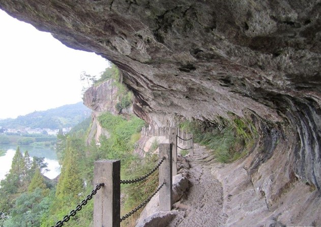 小赤壁 ,倪翁洞向東過溪,絕壁陡峭,東西橫亙長數里,石壁下部呈赭紅色,猶如焰火燒過,故稱小赤壁。懸崖中有一天然棧道,長數百米,稱龍耕路,相傳是東漢光武帝劉秀駕龍耕出來的。龍耕路中有丹室、超妙軒遺址,相傳是明吏部天官鄭汝壁和狀元張懋修(張居正三子)隱居之所。小赤壁一帶,溪中有島,島中有湖,恰似蓬萊仙境,還有八仙亭、蓬萊閣等人文景觀。