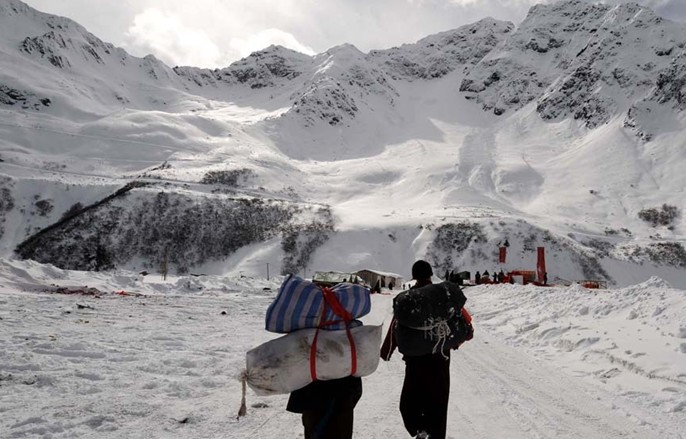 當(dāng)?shù)厝嗣癫叫谐鋈肽摰穆分饕袃蓷l:一條是從米林縣派鄉(xiāng)翻越喜馬拉雅山脈的多雄拉山口,沿多雄拉到墨脫的背崩鄉(xiāng)后,逆雅魯藏布江北上至墨脫縣城,全程約115千米,步行需4天時(shí)間。這條路在每年的6-10月份可以通行;另一條是從波密縣沿扎墨公路行走,全程141千米。由于嘎龍山的阻擋,這條路只能在每年的8-10月初山上的冰雪融化后才能通行到80千米處,然后步行兩天到墨脫縣城,其他時(shí)間只能翻越海拔4640米的嘎龍拉山口,正常情況下步行約需5天時(shí)間。