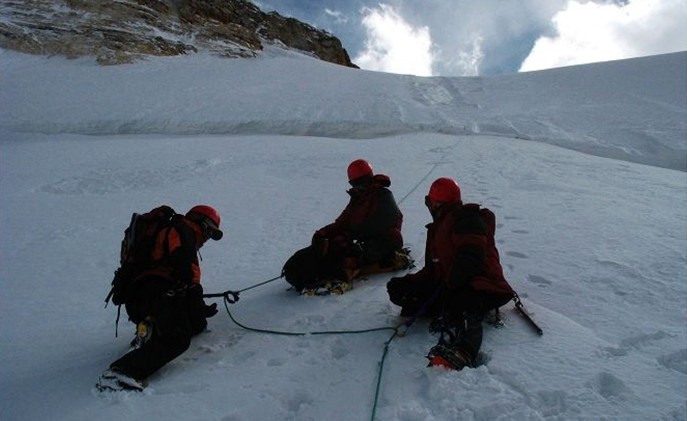三號營地到四號營地之間是東南山脊的刃脊,冰雪和巖石混合路段,雪坡上積雪較深,又有大的裂縫,必須拉繩索,此外還需要大量的路標。如果天氣不好,隊員在這里一旦迷路,極易掉入懸崖。