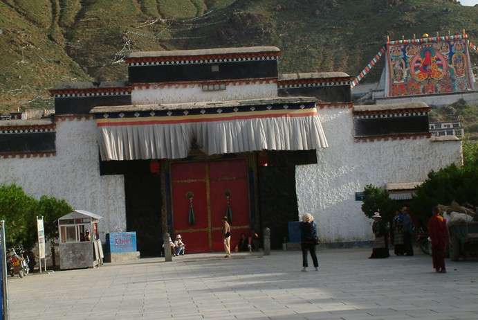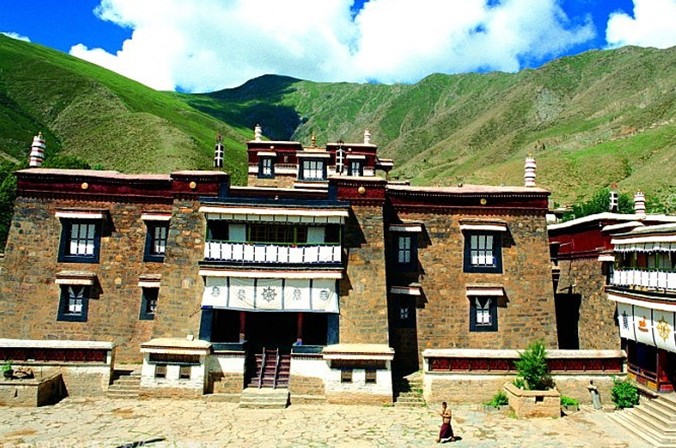 寺院坐西朝東,四面群山環抱,山清水秀,環境十分優美。面積約10萬余平方米,圍墻為多邊形。寺內主要建筑為祖拉康佛殿,坐西向東,高三層。底層為大經堂,面闊5間,進深6間,內有20根方柱,其中有兩根高5.5米的林柱通向二層。