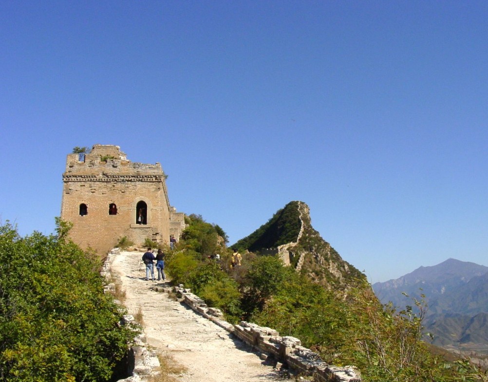 長城的最高處為“仙女樓”,需登“天梯”而上。天梯高達(dá)100米,坡度85度,幾近垂直,無膽量的絕難征服。仰頭上望,那磚石砌就的臺階僅可容腳,兩側(cè)懸崖陡壁,中間這一道臺階細(xì)如線,薄如刃,陡如立,不由人望梯興嘆,倒吸一口涼氣。爬上仙女樓,景色果然更加壯美秀麗,俯首看腳下的懸崖,刀削斧劈一般,幾縷霧嵐掛在絕壁處,更顯得陡峭驚險(xiǎn)。西北邊金山嶺長城與司馬臺長城渾然一體,活象一條即將騰飛的蒼龍。長城上大小不同、形態(tài)各異的敵樓,恰到好處地建立在各個(gè)制高點(diǎn)上,威風(fēng)凜然,冷峻挺拔。整段長城,完美和諧,氣勢磅礴,處處顯示出她的巧妙、奇特、雄偉和壯麗。再看看連綿不斷的燕山山脈奔涌而起,疊起無數(shù)的奇幻;看看遼闊的華北平原無邊無際,一直鋪向目不所及的天邊,在這博大奇異的景色中,令人不由浮想聯(lián)翩。