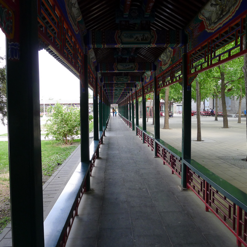 從南門入園,走過門廳,穿過曲折的彩繪長廊,迎面矗立著一座藍琉璃瓦頂?shù)挠晒纛}寫的“保衛(wèi)和平”漢白玉石坊(原稱“克林德”坊和“公理戰(zhàn)勝”坊)。放眼北望,古柏成林,大多是明代所栽。其中有7株挺拔參天,要三、四人方能合抱。形態(tài)各異的古柏相傳為遼時種植,迄今已逾千年。還有一株槐樹與柏樹相抱而生。稱“槐柏合抱”,至今仍枝繁葉茂,蔚為奇觀。由此西行就到了壇門外,一對雄俊的石獅系北宋遺物,是1918年從河北大名的一座古廟廢墟中發(fā)掘遷來守門的。