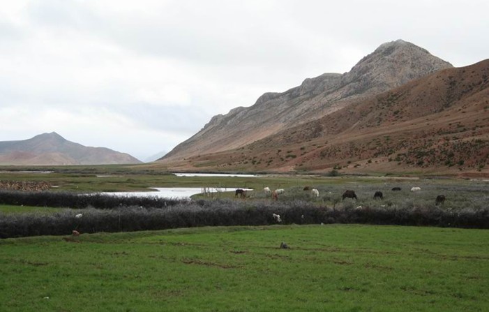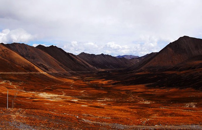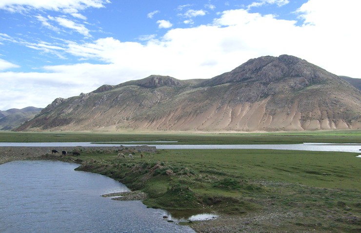 位處昌都地區三江流域之高山深谷中的邦達草原是一塊地勢寬緩、水草豐美的高寒草原。怒江支流玉曲上游蜿蜒流淌其中,兩岸廣闊的低濕灘地上生長著茂密低矮的大蒿草、苔草之類的草甸植物,綠茵如氈,除成群牛羊在那里游蕩覓食外,偶爾也會有一些藏原羚出沒于其間。圖上所示為冬季時節的邦達草原,牧草已趨枯黃,顯得有點蕭索荒涼,缺少些許生機。然而因位處西藏東部,降水稍多于西藏中西部地區,牧草生長狀況較好,這里是西藏境內較為優良的天然草場,畜牧業比較發達。