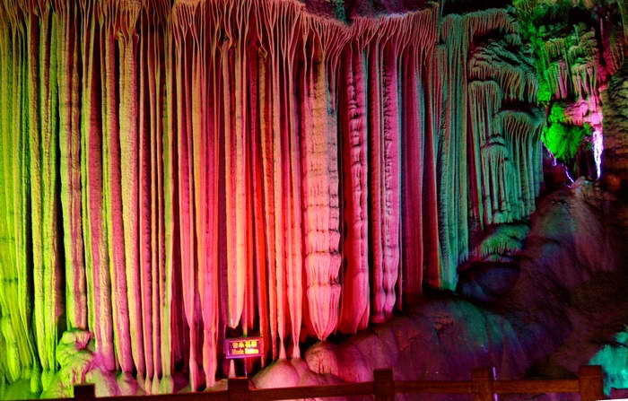 進(jìn)入景區(qū),似步入世外桃源,群山環(huán)抱,碧水潺潺,楊柳婀娜,桃花滿園。古寨依山而座,炊煙裊裊,雞犬相聞,淳樸的鄉(xiāng)風(fēng)讓人迷醉,飲一碗地道的油茶,品一杯香醇的水酒,傾聽關(guān)于銀子巖的神秘傳說(shuō),讓人忘卻紅塵,不忍歸去。走進(jìn)銀子巖,如水般的清涼和平靜撲面而來(lái);明白了栩栩如生、惟妙惟肖、巧奪天工。贊嘆、驚訝、緊張,銀子巖的鐘乳石奇形怪狀,在各色燈光的照射下,一條條石筍上就像綴滿了銀粉,白的像一塊塊玉石,紅的似一簇簇珊瑚,綠的若一片片翡翠,黃的如一顆顆琥珀。燈光與天然的石筍融為一體,好一個(gè)人間仙境。穿行在銀光四射、熠熠生輝的石府中,游客會(huì)深刻地領(lǐng)悟到銀子巖三個(gè)字的由來(lái)。巖洞有老中青幼四種不同年紀(jì)的石鐘乳,老的色澤蒼黃,中青年的則白里透黃,色澤明艷,幼年則銀白如玉。銀子巖地貌奇特,有偉岸的音樂(lè)石屏,彈指有聲,聲如天籟;有繽紛的林海雪原,寬闊遼遠(yuǎn),不知其源頭;地面的沖積巖酷似萬(wàn)里長(zhǎng)城,蜿蜒起伏在洞穴之中;巖頂?shù)墓质跓艄獾妮x映下,有的巨大的豎琴排列齊整,有的像南天一柱的定海神針,有的如獅虎猛獸,有的像入定高僧,有的似域外仙人,奇美景象應(yīng)接不暇。宛如漫步在廣寒宮,幻象不斷。