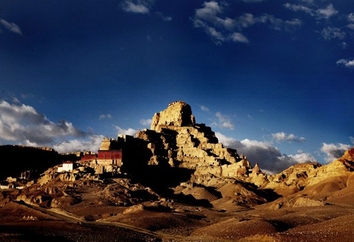 古格王國是在公元十世紀前后,由吐蕃王朝末代贊普朗達瑪的重孫吉德尼瑪袞在王朝崩潰后,率領親隨逃往阿里建立起來的。從它的建立就嗅得出悲情的色彩。這個王朝投影到現在,變成了阿里扎達札不讓區象泉河畔的一座土山,占地約18萬平方米,共有屋洞窟300余處、佛塔(高10余米)3座、寺廟4座、殿堂2間、地下暗道2條的遺跡。