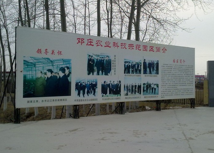 鄧莊農業科技示范園區始建于1998年6月,占地500畝,建成高級日光溫室150棟,全智能連棟溫室2棟,并建成工廠化育苗中心、無公害檢測中心、組織培養中心、肉奶牛胚胎移植中心、技術人才培訓中心、凈菜加工配送中心六個中心。2001年,鄧莊園區被認定為省級農業科技示范園區、河北省無公害蔬菜生產基地、河北省進京蔬菜生產供應基地。