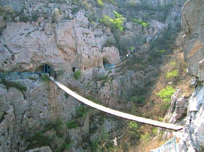 佛爺洞與七星洞有一峽谷相隔,景區開發者便凌空架起一道35米開的鐵索橋,把天塹變為通途使兩洞相連,人踏鐵索橋一步九顫蕩悠悠,頓生“大渡橋橫鐵索寒”之感。不過,這里的鐵索橋絕對安全,被人譽為“冀南一絕有驚無險”是游人獵奇探險鍛煉意志和膽量的絕佳場所。