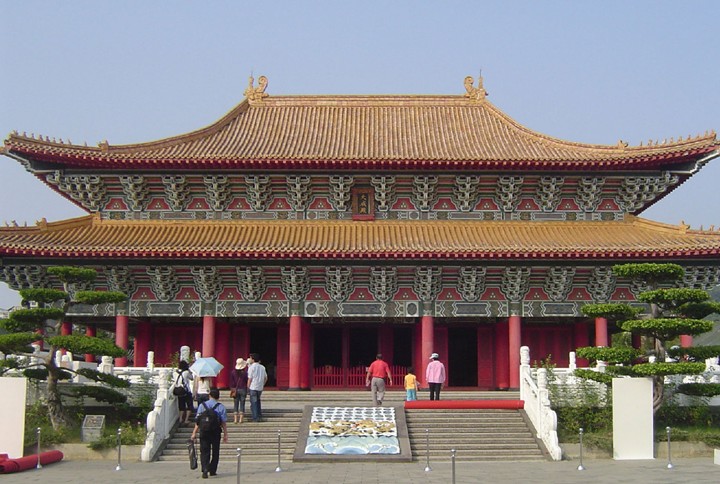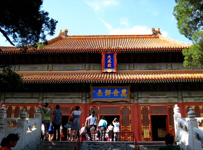 從杏壇北望,在雙層石欄的臺(tái)基上一座金黃色的大殿突兀凌空,雙重飛檐中海藍(lán)色的豎匾上木刻貼金的群龍緊緊團(tuán)護(hù)著3個(gè)金色大字“大成殿”。字徑1米,為清雍正皇帝手書。大成殿是孔廟的主殿,高24.8米,闊45.78米,深24.89米,重檐九 脊,黃瓦飛甍,周繞回廊,和故宮太和殿、岱廟宋天貺殿并稱為東方三大殿。大殿結(jié)構(gòu)簡(jiǎn)潔整齊,重檐飛翹,斗栱交錯(cuò),雕梁畫棟,金碧輝煌,藻井枋檁飾以云龍圖案,金箔貼裹,祥云繚繞,群龍競(jìng)飛。四周廊下環(huán)立28根雕龍石柱,均以整石刻成。柱高5.98米,直徑0.81米,承以重層寶裝覆蓮柱礎(chǔ),原為明弘治十三年(公元1500年)敕調(diào)徽州工匠刻制,清雍正二年火 后重刻。兩山及后檐的18根八棱磨淺雕石柱,以云龍為飾,每面淺刻9條團(tuán)龍,每柱72條,細(xì)心的工匠在石柱上記下了雕刻的龍的總數(shù),共1296條。前檐的10根為深浮雕,每柱兩龍對(duì)翔,盤繞升騰,中刻寶珠,四繞云焰,柱腳綴以山石,襯以波濤。10根龍柱兩兩相對(duì),各具變化。無一雷同,造型優(yōu)美生動(dòng),雕刻玲瓏剔透,刀法剛勁有力,龍姿栩栩如生。這是曲阜獨(dú)有的石刻藝術(shù)瑰寶,據(jù)說清乾隆皇帝來曲阜祭祀孔子時(shí),石柱均用紅綾包裹,不敢被皇帝看到,恐怕皇帝會(huì)因超過皇宮而怪罪。大成殿的建筑藝術(shù),充分顯示了我國勞動(dòng)人民的才華和智慧。 大成殿內(nèi)正中供奉孔子塑像,坐高3.35米,頭戴十二旒冠冕,身穿十二章王服,手捧鎮(zhèn)圭,一如古代天子禮制。兩側(cè)為四配,東位西向的是復(fù)圣顏回和述圣孔伋,西位東向的是宗圣曾參和亞圣孟軻。再外為十二哲,東位西向的是閔損、冉雍、端木賜、仲由、卜商、有若,西位東向的是冉耕、宰予、冉求、言偃、顓孫師、朱熹。四配塑像坐高2.6米,十二哲塑像坐高2米,均頭戴九旒冠,身穿九章,服,手執(zhí)躬圭,一如古代上公禮制。塑像都置于木制貼金神龕內(nèi),孔子像單龕,施十三踩斗栱,龕前兩柱各雕一條降龍,繞柱盤旋,姿態(tài)生動(dòng),雕刻玲瓏,異常精美。四配十二哲兩位一龕,各施九踩斗栱。龕前都有供桌、香案、擺滿祭祀時(shí)使用的籩、豆、爵等禮器。殿內(nèi)還陳列著祭祀孔子時(shí)中和韶樂樂器和舞具。殿外懸有10塊匾額、3副對(duì)聯(lián),門外正中是清雍正皇帝題書的“生民未有”匾額,殿內(nèi)正中是康熙皇帝題書的“萬世師表”和光緒皇帝題書的“斯文在茲”匾額,南面懸掛著乾隆皇帝題書的“時(shí)中立極”等匾額。每塊匾額長(zhǎng)6米多,高約2.6米,雕龍貼金,精美華麗。