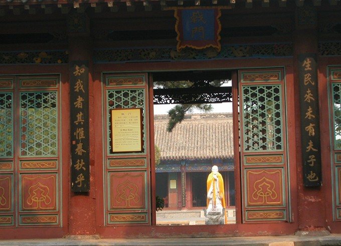 據(jù)《孟子》記載:“孟子曰:‘伯夷,圣之清者也;伊尹,圣之任者也;柳下惠,圣之和者也;孔子,圣之時(shí)者也。’”意思是說,在圣人之中孔子是最適合時(shí)代的。據(jù)此,清世宗于雍正八年(1730年)欽定孔廟正門名“圣時(shí)門”。圣時(shí)門始建于明永樂十三年(1415年),3間,弘治年間擴(kuò)為5間中設(shè)拱門3券,碧瓦歇山頂,四周是深紅的墻皮,券內(nèi)是杏黃的墻里,前后石階上各有石刻龍陛。由拱門內(nèi)望,令人有深邃莫測(cè)之感。