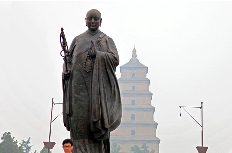 新建的占地20多畝的以玄奘為主題的大雁塔南廣場位于大慈恩寺門前,廣場中央臺座上,坐落著一尊高大的唐僧取經銅像,花壇錦簇,華燈成行,馬路寬闊,設施齊備。大慈恩寺大雁塔有著一千多年的光輝歷史,曾有過輝煌的一頁,據史書記載:唐貞觀二十二年(648年),大慈恩寺建成后,皇太子李治恭請玄奘任該寺上座,寺中專為玄奘辟有翻經院,供其翻譯佛經。為了協助玄奘譯經,還特地選擇了50名高僧作為玄奘的助理。玄奘由原來居住的弘福寺移居大慈恩寺時,舉行了隆重的儀式。玄奘與50名助理乘車,京城僧眾列隊隨后,文武百官侍衛陪同,太宗皇帝與太子李治及后宮嬪妃在安福樓上手持香爐目送,長安各界人士夾道歡呼。