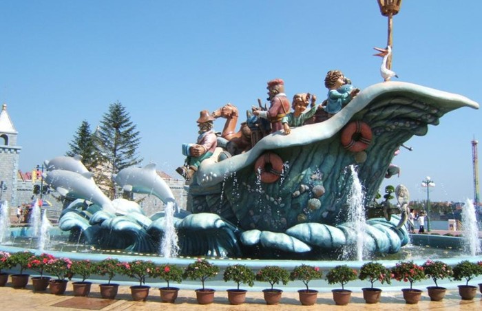 即使定力再強的人,當入了園后,心胸中還是會滌蕩著一種末名地沖動,眼前的一切,讓人恍若置身格林筆下的童話世界。發現王國地起點是發現廣場,也可以說是終點,因為公園娛樂是環形分布的,當第二次來到廣場時,大概就是離別的時候了。廣場上有做座美麗的街心噴泉,同樣的歐洲風格,可以和散布周圍的可愛的卡通形象合個影,公園的主角酷樂也在其中。不遠處公園中心位置有一座湖,想來,如果沒有這湖,大概以鋼鐵為主的公園會缺失一份靈動和親切吧,湖中央的城堡,很有羅琳的《哈利波特》中的魔法學校霍格沃茲的影子,見到的人都有種泛舟登堡的欲望,當被告知那是用來夜晚放焰火的時候,除了惋惜,又會憧憬夜晚了。