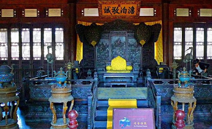 大殿建在大理石砌筑的臺基上,為青磚布瓦卷棚歇山式建筑, 古樸典雅,莊重肅然。殿內陳設豐富、素雅、凝重,與周圍的環境十分協調,顯示出皇家典雅的氣派。殿內陳設有成堂的家具、圖書、鐘表和古玩。殿中懸"澹泊敬誠"匾。中央為紫檀雕欄須彌座地坪,上置有紫檀浮雕耕織圖圍屏、紫檀彌勒寶座、足踏、座褥、靠背、迎手、羽葆、蟠龍、垂思香筒、仙鶴、香幾、印盒等,周圍有薰爐、爐幾、琺瑯爐、東大案、西大案,案上有鐘表、青花貫耳尊、霽蘭天球瓶、青花雙耳尊、五彩山水鹿頭尊、紫檀雕龍大立柜等。