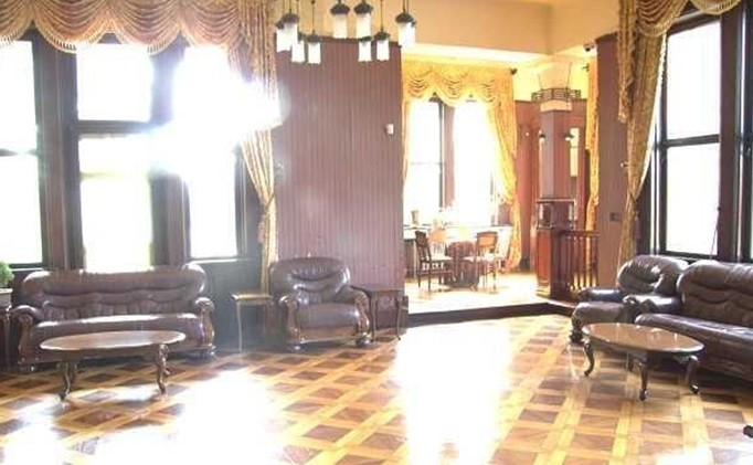 由西門進入既為第二層,習(xí)慣稱為一樓,內(nèi)設(shè)過門廳、中廳、大廳、會議室、舞廳、餐廳和花房等組成,大廳高為9米,頂部懸以華麗的吊燈。大廳的墻壁上裝飾銅雕藝術(shù)品和油畫,墻下部圍以棕色的護板;一側(cè)墻角處是一個嵌著綠色玉石的壁爐,另一角擺放著一架古老的德國三角架鋼琴,大廳墻壁上掛有一只鐘表是德國著名鐘表設(shè)計家瓊漢斯設(shè)計的,它有一個特點是一小時報四次時,每一刻響音樂,整點是敲鐘點。整個大廳充滿了古樸濃郁的西方情調(diào)。