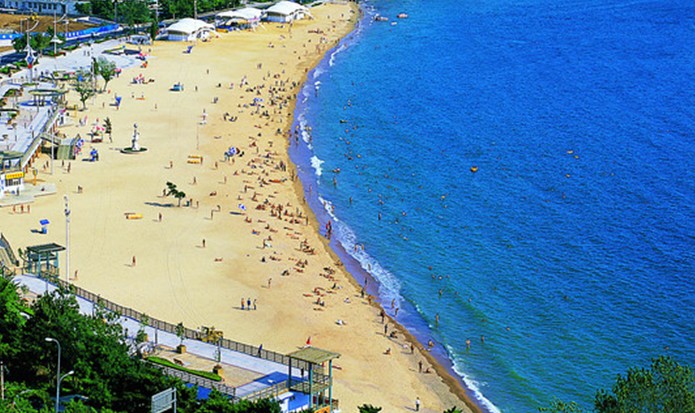 第三海水浴場也叫山海天浴場,位于太平角東側,湛山灣畔,規模雖不大,但海水卻異常清澈。沙灘上建有一幢幢風格多樣的更衣室,更衣室沖浴的水是熱水,對不習慣冷水沖浴者尤為適宜。