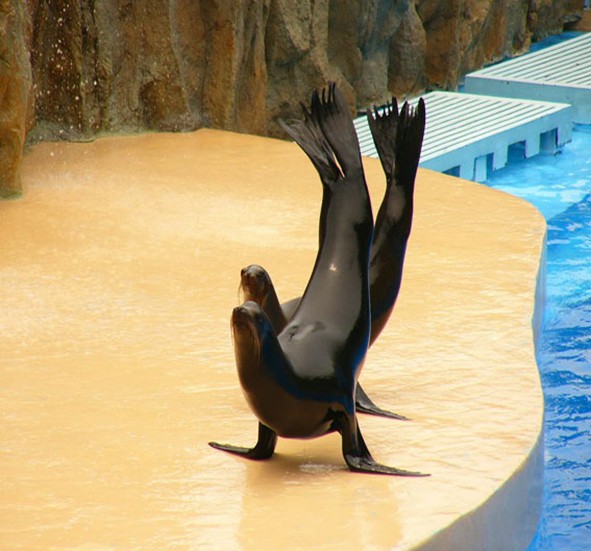 1997年5月從烏拉圭引進(jìn)的4頭南美海獅(分別起名為“歡歡”、“樂樂”、“海海”、“琴琴”)更是非常聰明、可愛,是海獸表演家庭的幽默大師,別看它們其貌不揚(yáng),可在馴養(yǎng)師的嚴(yán)格訓(xùn)練下,也能表演“握手”、親吻、問候、套圈、學(xué)人走路、鼓掌、再見、翻滾以及高難度的“頂球”、“單手倒立”、“一獅兩球”、《海獅學(xué)校》等近20余個(gè)精彩節(jié)目,其幽默滑稽的表演,令觀眾捧腹大笑。