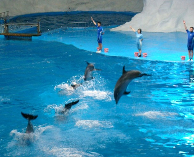 位于主體建筑內(nèi),鋼筋混凝土結(jié)構(gòu),梯形看臺,扇形排列,1800個(gè)坐席。表演池長22米,寬12米,池深5米,前壁透明玻璃墻體。海豚、海獅可表演空中跳躍、高空鉆圈、飛越彩虹、人獸共舞、算算術(shù)、與海豚親吻及海獅樂隊(duì)等20余個(gè)精彩節(jié)目。
