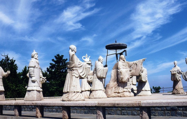 在瑯琊臺頂,共有石雕像14尊:秦始皇、徐福、胡亥、李斯、趙高和文武官員、武士、侍女、侍從等。群雕生動地表現了公元前210年秦始皇第三次巡游瑯琊時,徐福向秦始皇講述海上求仙經過的場面。版權所有山東聊城聊之旅國際旅行社有限公司,轉載必究!作品的整體氣韻與古臺、高天、大海和群山的背景渾然融合而又相互襯托,氣勢宏大。群雕把一個充滿傳奇色彩的歷史場面燦然凝固在瑯琊臺上。