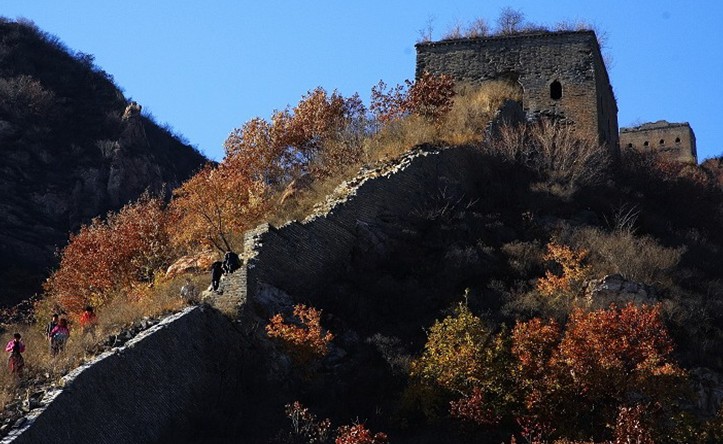 由關口順長城南上,沿途城墻至今保存完好,長城垛口隨山勢高低起伏,呈鋸齒狀,形勢別致而壯觀。沿線有兩座建筑獨特的敵樓,一是監獄樓,此樓無門,只在正上方有一眼通氣孔,為古代戰時囚禁戰俘之用。通氣孔距地面1丈8尺,四壁光滑,難以攀附,戰時擒獲的敵人,由孔投入,絕難逃脫;二是七十二券樓,建筑造型在長城上獨一無二,此樓由大小七十二拱券結構而成,造型美觀堅固,組合巧妙,實屬長城建筑的一大奇觀。