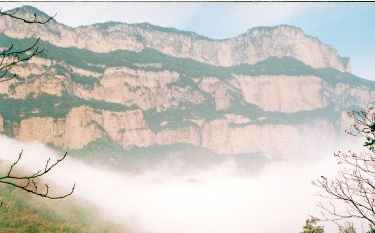 如果誰要是不知“層巒疊嶂”這個詞的確切含義,就到嶂石巖去讀吧。它的山巒成三疊,每一疊都如紅色屏 嶂石巖風,高一二百丈,廣數里,石壁光滑如磨,纖草不生,飛鳥難落,猿猴難攀。每兩疊間錯落成平臺,樹茂草豐,呈綠色環帶。