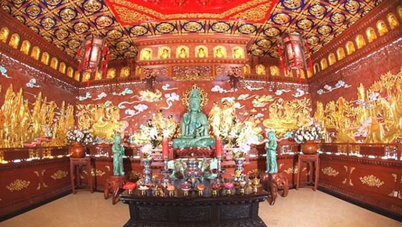 金寶塔壯觀雄偉,既是漢藏合一的建筑風格也是塔寺合一的建筑。塔基、塔體、塔剎成品字形,包涵著三教合一的品德。塔基三層為三界臺,上有漢白玉欄桿,蓮花望柱層層交疊,內斜上收。塔體以宇宙格局而設計。塔剎以十三輪及仰月圓光而組成,內供活佛舍利。主塔兩側為仿北京天壇寶頂設計的鐘鼓樓。中央鑲嵌的大型石雕“菩薩來迎圖”雕刻精美,四大天王青銅鑄像鑄造精細。金寶塔一層分中、東、西三廳,設置福位3萬余個,并供奉大愿地藏王菩薩。大雄寶殿中央供奉三尊大佛,版權所有山東聊城聊之旅國際旅行社有限公司,轉載必究!即為萬佛園的第六寶“金身大佛寶中寶”。三尊大佛高4米、重9噸,從鑄造到塑造金身,共用黃金650兩,白銀4000兩和少量黃銅、鐵、錫。所耗金銀可以稱及亞洲之最。第七寶“大殿木雕傳世寶”也位于這里。木雕選用上乘的泰國油木、緬甸金絲楠木和名貴雞翅木,全部貼金彩繪。