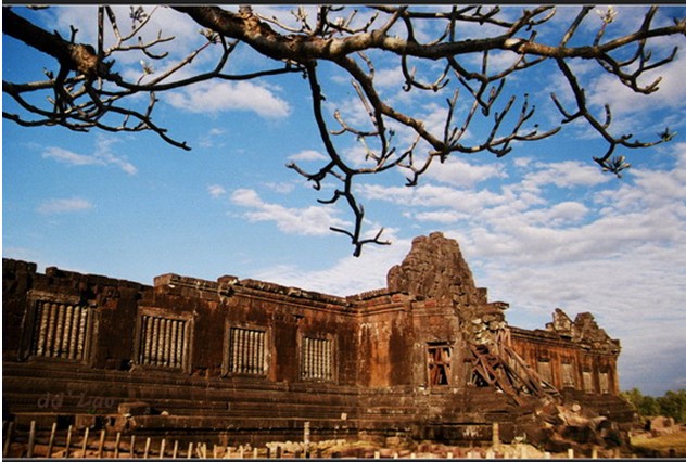 底部由位于一座巨大的方形水池邊緣的兩座宮殿建筑廢墟組成好,水池由一條用于洗禮儀式的雨道一分為二。上部是寺廟的大殿,里面曾經(jīng)供奉過一座巨大的濕婆生殖器。不過后來,這座神廟被改成了佛教寺廟,但是原先的印度教雕刻還保留在了門檻上就在。濕婆生殖器大殿的北邊,有一座大象石和一座神秘的鱷魚石。通往圣殿的神龍(naga)臺階兩側(cè)是成排的紫薇花(dokjampa)樹。在上層的平臺上面可以俯瞰道腳下壯觀的湄公河河谷。