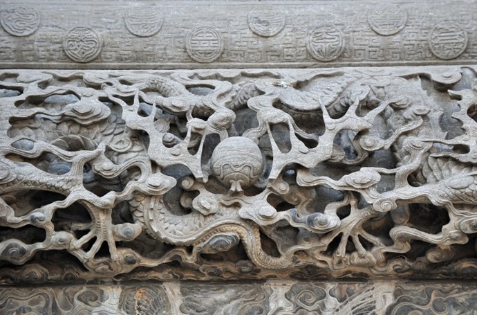 八根夾柱分八組雕刻百個石獅。大獅巨頭卷毛突目,隆鼻闊口利齒,巍然蹲踞,矯捷威猛。每個大獅身上攀伏著五個小獅,有的撓癢自娛,有的伏在大獅的腿上,舔咂撫鈴。獅座前左右三面浮雕圓形松獅圖,幼獅三三兩兩,蹦跳翻滾,爭戲繡球。每根立柱透雕四條蛟龍,在柔美飄逸的祥 云間卷舒出沒,盤旋回舞。正間上下額枋、次間額枋及正檐下“圣旨”匾四周鏤空透雕二龍戲珠,雕龍懸目奮爪,搖頭擺尾,如騰似飛。正間中額枋上分三層鏤空透雕串枝牡丹,給人以五彩繽紛、香沁肺腑之感。牡丹間以變形的“卍”字形云紋,寓意“富貴萬年”,樓檐下獸斗花拱,如意枋板承托。脊和檐角上雕配的吻獸、象尊、岔獸、魚、海馬、跑獸皆造型優美,生動傳神。吻尾外卷張口吞脊,每個吻獸身上又浮雕兩條游龍,生動活潑,象馱寶瓶,憨態可掬。正脊中間雕塑二龍朝天,相托一珠瓶類飾物,像塔剎一樣高聳空中。其他部位也均浮雕、平雕有雙龍、牡丹、菊花、團鶴、團壽等吉祥圖,正間下枋板的孔鼻上還雕一懸掛石鳥籠,微風吹來,石鳥翩翩展翅,呤叮作鳴。整座牌坊結構精巧,宏偉壯觀,雕刻精細,玲瓏剔透,繁而不亂,主次分明,是全國罕見的典型清代石雕建筑。