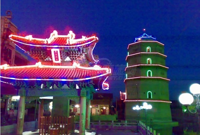 永豐塔 位于巨野縣城東南角,南臨人民路,北距文廟百余米,西面不遠(yuǎn)是永豐街,東面緊靠縣招待所,是縣級(jí)重點(diǎn)保護(hù)文物。始建于五代后周(公元951-960年),至北宋年間(公元960一1127年)才建成。塔為磚石結(jié)構(gòu),高30米,為七級(jí)八角四門(mén)樓閣式,上層周長(zhǎng)36米,下層周長(zhǎng)44米,塔尖為圓型亭式磚木結(jié)構(gòu),高1.85米,青瓦覆蓋。地面上現(xiàn)存5層,底部2層已淤于地下。永豐塔已有千余年歷史,歷經(jīng)洪水、地震,仍完好無(wú)損。清晨登塔眺望,東面山色蒙蒙,霞光絢麗,北有文廟大成殿,雄偉壯觀。永豐塔附近還有菏塔、石橋與之交相輝映,景色甚美 。