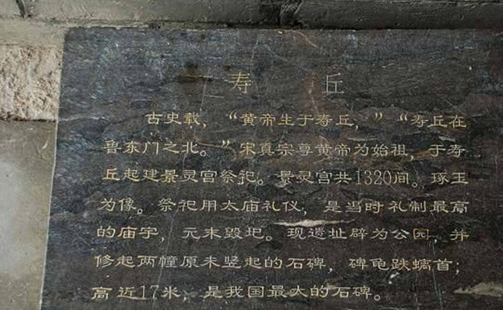 《曲阜縣志•古跡》載:宋大中祥符五年閏十月,宋真宗以始祖黃帝生于壽丘之故,下詔改曲阜縣名為仙源縣,并徙治所于壽丘。詔建景靈宮于壽丘,以奉祀黃帝。根據《曲阜縣志》引元代至正十年周伯琦《重修景靈宮記》石碑記載:帝建宮祠軒轅曰圣祖,又建太極殿祠其配(應為母)曰圣母。越四年而宮成,總千三百二十楹,其崇宏壯麗無比,……琢玉石為像龕于中殿,以表尊嚴,歲時朝獻如太廟儀,命學老氏者侍祠,而以大臣領之。大碑四通,諺云:‘萬人愁’者是也,其中二碑廣二十三尺,闊半之,厚四尺;赑屃高十有三尺,闊半之,厚四尺,龜趺十有八尺。另二碑廣二十有四尺,闊半之,厚四尺,赑屃高十有八尺,闊十有六尺,厚四尺,龜趺十有九尺,無文字,意者未成而金兵至也。陵曰壽陵(即壽丘)。