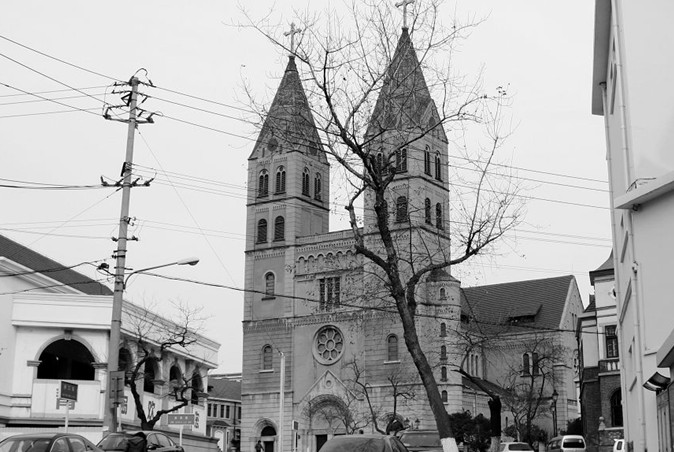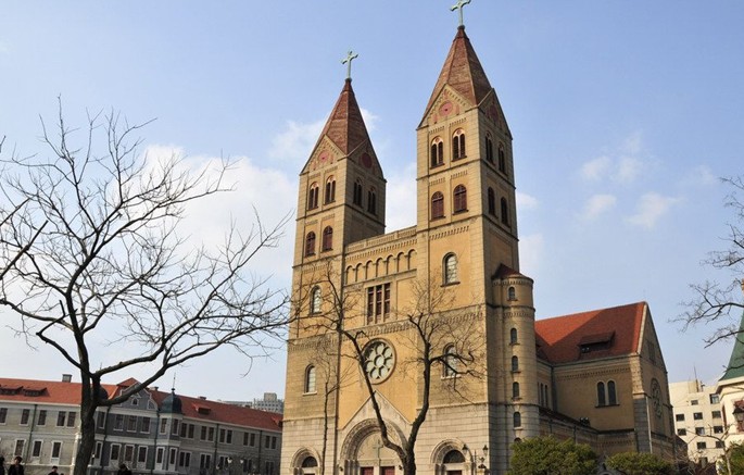 青島天主教堂本名圣彌厄爾教堂,由德國設計師畢婁哈依據哥德式和羅馬式建筑風格而設計。擬建教堂應高百米,適逢二戰爆發,希特勒嚴禁德國本土資金外流,該教堂不得不修改圖紙,即建成現在規模。教堂始建于1932年,于1934年竣工。