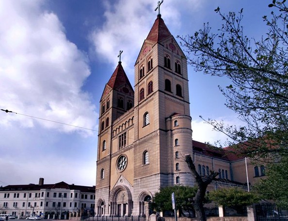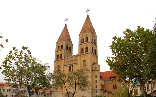 占地面積11480平方米,其中建筑面積6301.54平方米。教堂以黃色花崗巖和鋼筋混凝土砌成,表面雕以簡潔優美的紋案。窗戶為半圓拱形,線條流暢,顯得莊重而樸素。大門上方設一巨大玫瑰窗,兩側各聳立一座鐘塔,塔身高56米,紅瓦覆蓋的錐形塔尖上各豎立一個4.5米高的巨大十字架,版權所有山東聊城聊之旅國際旅行社有限公司,轉載必究!塔內懸有四口大鐘,一但鐘樂鳴奏,聲傳數里之外。進入教堂,是一個高達18米,可容千人的寬敞明亮的大廳,色彩斑斕的玻璃花窗透射出柔和的光線。大廳東西兩側設有走廊,后面設有兩個大祭臺,四個小祭臺,廳的穹頂繪以圣象壁畫,燈光炫目,充滿濃厚的宗教氣氛。屋頂覆蓋舌頭紅瓦,其氣勢龐大,且又古樸典雅。