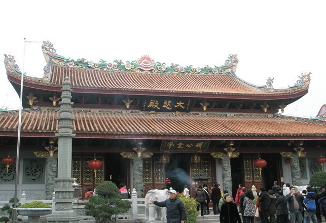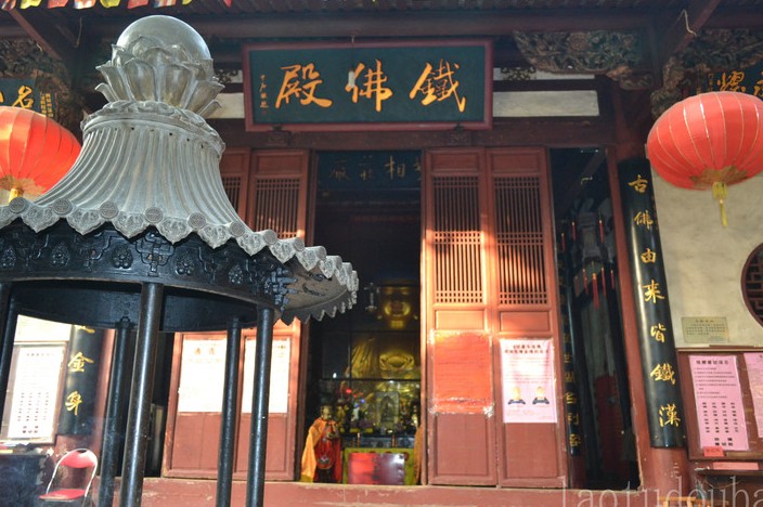 鐵佛殿內(nèi)有鐵佛一尊,稱“阿彌陀佛”,疊掌跏趺坐于蓮花臺上,外披泥貼,法相莊嚴(yán)。鐵佛高5.3公尺,頭部實心,身軀空心,人立其肩上,伸手摸不到頭頂,估計重量達(dá)十萬斤以上。清乾隆時陳云程《閩中摭聞》載,版權(quán)所有山東聊城聊之旅國際旅行社有限公司,轉(zhuǎn)載必究!鐵佛殿前柱子兩側(cè)刻有明末舉人曾異所撰楹聯(lián):“古佛由來皆鐵漢,凡夫但說是金身。”