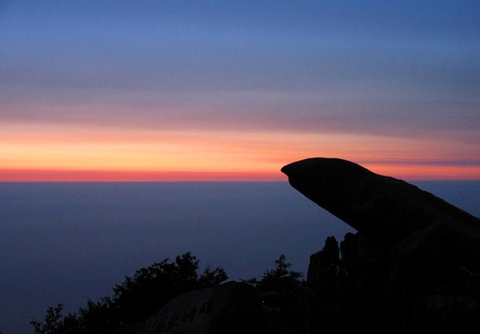 探海石,是位于岱頂的一塊突兀伸出的怪石,其上可觀云海玉盤奇景。夏天,雨后初晴,大量水蒸氣蒸發上升,加之夏季從海上吹來的暖溫空氣被高壓氣流控制在海拔 1500米左右的高度時,如果無風,在岱頂就會看見白云平鋪萬里,猶如一個巨大的玉盤懸浮在天地之間。遠處的群山全被云霧吞沒,只有幾座山頭露出云端;近處游人踏云駕霧,仿佛來到了天外。