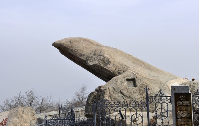 當你登上五岳之尊的泰山之巔,你一定會去玉皇頂東側的觀日峰,因為那里是晨望日出奇觀,暮觀晚霞美景,晴賞山河壯麗,陰看彩云飛渡的最佳去處。在日觀峰上,有一巨石向北(偏西8°左右)斜上橫出,名為拱北石,仿佛一只報曉的雄雞,翹首以待,猶如起身探海,故又名探海石。拱北石平地向前探出兩丈多遠,象一把帶鞘的利劍斜刺蒼天。長近10米、寬約3.2米、厚為1.5米左右。此石與地面夾角為30°,高出周圍地面,其北、東兩面均為懸崖峭壁,顯得神奇而又險峻。學者王克煜說,探海石是岱頂著名景點之一,也是泰山的象征和重要標志。它像一只報曉的雄雞,氣宇軒昂地佇立在泰山之巔,翹首以待,為世人迎來輝煌的黎明。清代著名清官李興祖曾為此留下“才聽天雞報曉聲,扶桑旭日已初明。蒼茫海氣連云動,石上有人別有情”的詩句。
