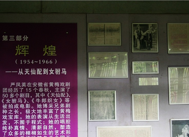那是1947年的10月份,嚴鳳英當年只有17歲,她那靈雀般的歌喉和輕盈舞姿吸引了秋浦兩岸的百姓,深受大伯大嬸們的喜愛。嚴鳳英是隨她的師父程積善(貴池晏塘人)來到秋浦的,當時搭班唱戲的還有銅陵的桂月娥、桂天賜,殷匯的宋再春、洪連梓等老藝人。先在高坦一大地主的后花園搭臺唱,后在灌口祠堂里唱,據(jù)說在唱《槐蔭別》時,嚴鳳英來了例假,被廣大的秋浦觀眾諒解后,又深為沒有看到嚴鳳英“別夫上天”的精彩表演而惋惜。最后在殷匯老街蘇家當鋪大屋唱,據(jù)說當時票價僅為三角一張(舊幣)。嚴鳳英在秋浦河兩岸前后共唱了三個月,演出的大戲有《小辭店》、《槐蔭別》、《珍珠塔》、《二龍山》、《山伯訪友》等,小戲有《蘭橋汲水》、《春香鬧學》、《送香茶》、《西樓會》、《打豬草》、《游春》等,如陣陣山野吹來的風,帶著泥土香,陶醉了秋浦兩岸的觀眾。嚴鳳英不僅藝高,人也好,肯結(jié)人緣,在秋浦唱戲時,每到一處,還和房東結(jié)了干媽干嬸。據(jù)現(xiàn)在還健在的八旬老人韓發(fā)祥回憶,嚴鳳英在殷匯唱戲時,恰逢他結(jié)婚,新婚之夜,嚴鳳英還和當?shù)匦〗忝脗円积R鬧新房,大伯、大嬸們親切地喊她“小嚴”或“紅六”,她口口聲聲答應得親嫡嫡的像親生女兒一樣。