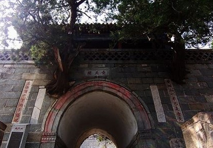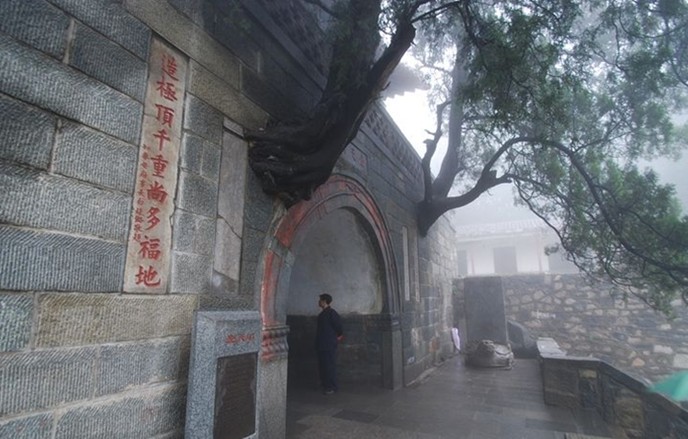 清嘉慶六年即公元1801年泰安太守崔映辰題聯:“壺天日月開靈境,盤路風云入翠微。”嘉慶二十一年即公元1816年泰安府事廷璐又聯:“登此山一半已是壺天,造極頂千重尚多福地。”這里海拔為800米,大致是泰山高度的一半,門洞有雙柏自墻中橫生,東西對峙,盤旋而上,宛如守護山門的雷祖、真武二將軍,堪稱奇景。
