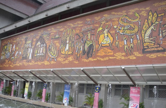 古典式馬來建筑的墻面上裝飾著兩幅巨大壁畫,長(zhǎng)35.1米,高 6米,左側(cè)是表現(xiàn)馬來西亞各種手工藝品制造的全過程,右側(cè)是從12世紀(jì)起至1957年馬來西亞獨(dú)立的各個(gè)歷史時(shí)期的重要場(chǎng)面。