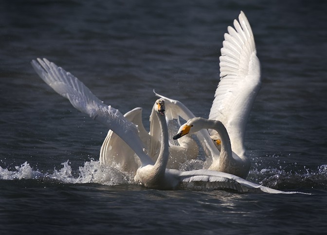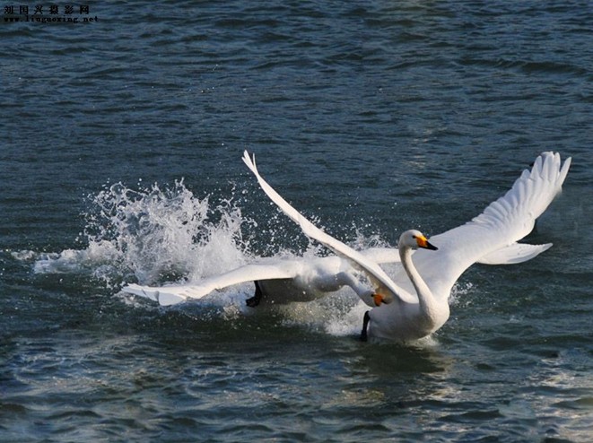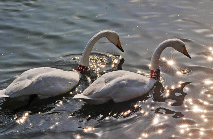 每當村民或游客走進海灣投放食物時,大天鵝就不約而同地向岸邊涌來,金色的玉米粒撒向藍色的水面和潔凈的沙灘,溫文爾雅的大天鵝也都爭相游到村民、游客周圍,毫不防范地搶食嬉戲,稍遠處的還貼著水面低飛而來。版權所有山東聊城聊之旅國際旅行社有限公司,轉載必究!初見人與天鵝如此近距離地接觸,有人還以為這是一群人工豢養的天鵝呢,可天鵝脖子上的紅色“環志”分明在告訴他們,這可都是不遠萬里飛來的野生大天鵝啊。