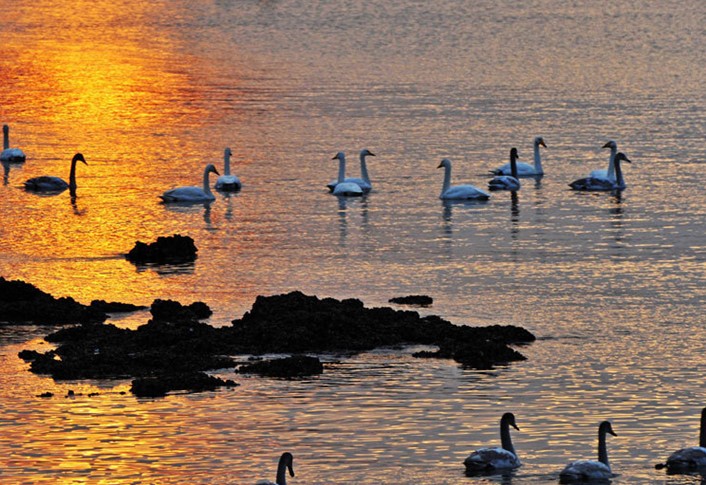 榮成成山衛天鵝湖位于成山鎮境內,是中國北方最大的天鵝湖。這里明清時為防務要地,明末曾試圖在這里開鑿至朝陽港的運河。近世由于泥沙淤積,港灣逐漸變成半封閉的橢圓形瀉湖。湖內面積有6.3平方公里,平均水深為2米,最深不過3米,一月份平均水溫為0.9℃,湖面很少結冰,湖中繁衍棲息著大量的小魚小蝦和浮游生物,是大天鵝冬季的理想生存之地,吸引了國家一類、二類保護動物近300種十幾萬只珍鳥。