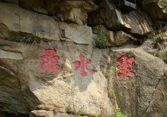 玉陽洞西側下方有一天然石洞〔俗稱“濕洞”〕,洞口像張開的巨大蛤蟆嘴。洞壁巖石交合處,東西各有一個石縫,圣水從石縫中流出。據《寧海州志》記載:“洞中東西二流,自石罅出,激激如線,二源一停一注,十二年一周,東西相更代,故曰‘圣水’。且天將雨,則漏天滴滴,濺人衣裙,版權所有山東聊城聊之旅國際旅行社有限公司,轉載必究!晴則否,山下人以此卜陰晴屢驗。”金朝散大夫 有文云“水不見發源,但嵌嵌之下,裂石而出,激激如線,味甘冷且清,春秋不變,水旱不知,蛙蠅之屬未嘗產焉,此亦異也。”欄版上題銘:“大安三年(1211年)二月日高 生說囗”。