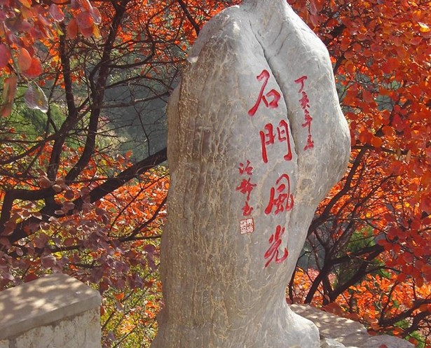 石門坊群峰環翠,壁立千仞,嶙峋夔石,青者如黛,白者如堊,峭者 如削,剝者如脫。紅葉黃櫨遍布山崗峽谷,每值深秋,霜打紅葉,潑染山紅;叢櫨間柏,漫紅嵌黛,丹青麗雅,瑰麗如畫。重陽時節,中外游客 慕名觀賞石門紅葉,絡繹不絕。