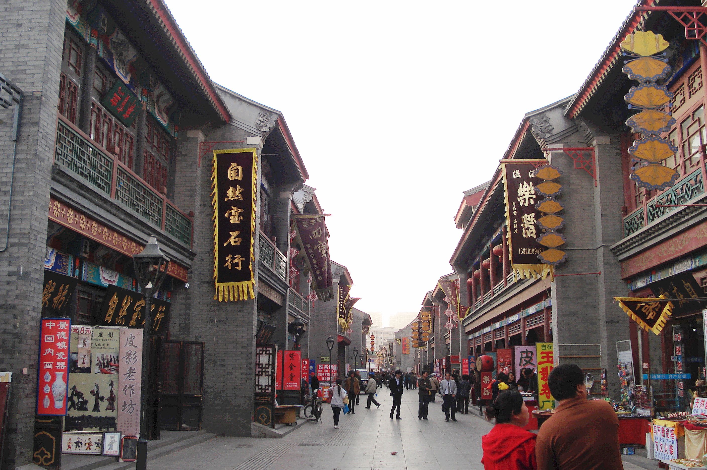 由仿中國清代民間小式店鋪組成的街道 。 以元代古跡天后宮為中心,古文化街位于天津南開區東北隅東門外,海河西岸,北至東北角,位于鬧市區,起老鐵橋大街(宮北大街),東臨海河、南至水閣大街(宮南大街)。南北街口各有牌坊一座,上書“津門故里”和“沽上藝苑”,長687米,寬5米,系商業步行街。這里在古代是祭祀海神和船工聚會娛樂之場所。現已修復的古文化街包括天后宮及宮南、宮北大街。天后宮俗稱“娘娘宮”,是古文化街上的主要參觀旅游項目。