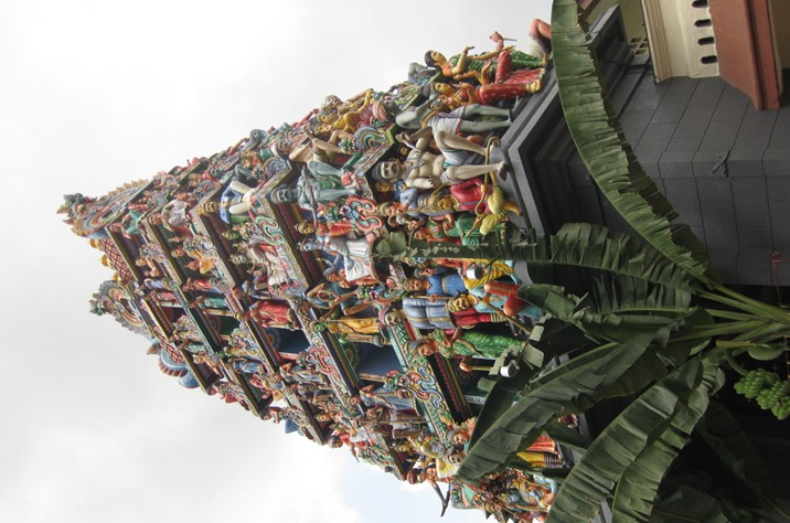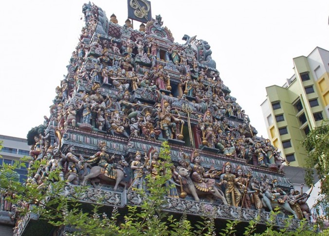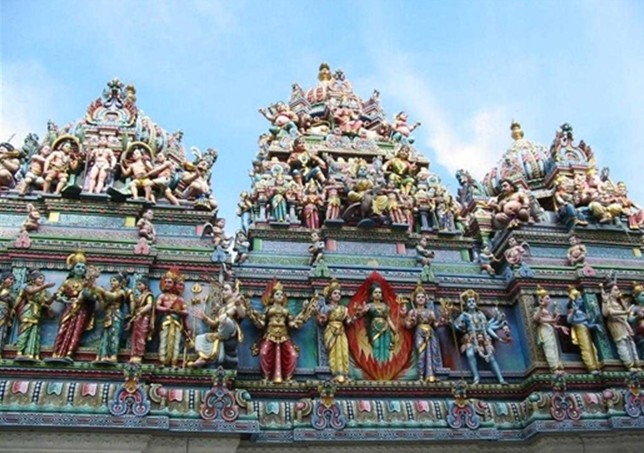 維拉瑪卡里雅曼興都廟(Sri Veeramakliaman Temple)建于1855年。特殊的彩繪門樓屬典型的南印度建筑風格,門上高聳的塔樓上裝飾許多立體的彩色神像,廟里則是供奉主掌生死的"卡莉女神"(Kali)。雕刻在門樓上的印度教諸神與圣物牛、斗士等,在太陽的照耀下閃閃發(fā)光,耀人眼目。寺廟周圍的墻壁,都被涂成紅白色,極富喜慶氣氛。