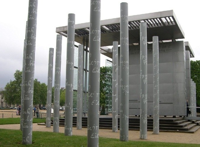 遠處就能夠看到紀念碑那高達70米的碑身高聳入云。四支錐形的白色石柱,組成一座巨大的錐形石塔,插入藍天,象征新加坡的華裔、馬來人、印度裔和歐亞裔所共同擔負的苦難和精神。紀念碑四周環繞著碧水,方形基座的南北兩面由石階分成四個面,分別由四種文字寫著“日本占領時期死難人民紀念碑 1942-1945”。沿石階而行,穿過水池,來到紀念碑的中心。在四支石柱上,各自有一面銘文,記錄著紀念碑建立的始末。而在整個建筑的中央,有一尊半人高的方形石臺,四面都有不同文字的銘文,中文部分這樣寫道: