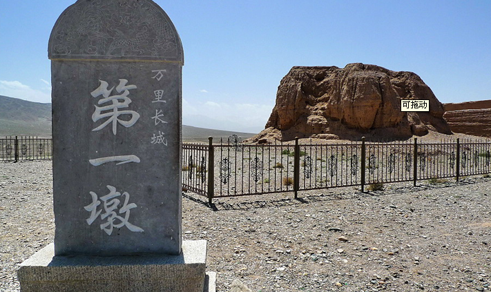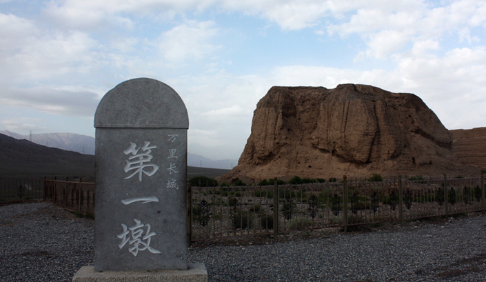 長城第一墩是明代萬里長城西端起點,也是長城沿線建筑規模最壯觀、保存最完整的一座古代軍事關隘。長城第一墩,又稱討賴河墩,是嘉峪關西長城最南端的一座墩臺,也是明代萬里長城最西端的一座墩臺。長城第一墩于明嘉靖十八年(公元1539)年由肅州兵備道李涵監筑,北距關城7.5公里,墩臺矗立于討賴河邊近56米高的懸崖之上。對于它的雄險,著名長城專家羅哲文先生曾經有過生動的吟詠:“嘉峪關,雄險畫皆難,墩堡遙遙相互望,長城道道連關山,猿臂也難攀”。在一萬多華里的明代長城線上,墩臺無數,密如繁星,而嘉峪關長城第一墩與河北山海關渤海之濱的“老龍頭”遙相呼應,共同構筑起中華長城“龍”的首尾,成就了中華民族“龍”的美名。如果說長城是中華民族的豐碑,那么長城第一墩就是這座豐碑崛起的地方。現在,這座墩臺殘高約10米,其底部呈不規則正方形,底寬14米,內部仍呈正方形,長寬均為6米。用黃土夯筑而成,夯土層厚10~20厘米。“長城第一墩”碑文由已故的西路軍將領魏傳統題寫,字跡飄逸灑脫,清秀雋永。